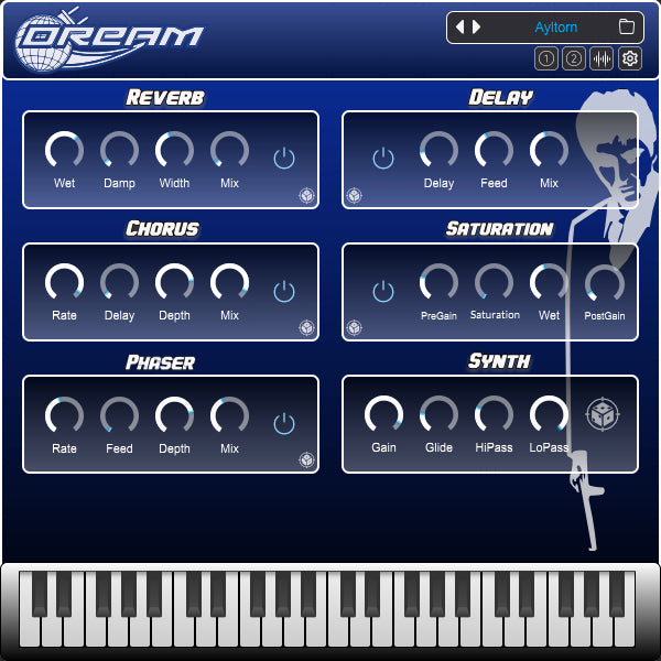 Reverb, Delay, Chorus, Phaser, Saturation, Glide, Low & Hi-pass Filter, Randomizer.